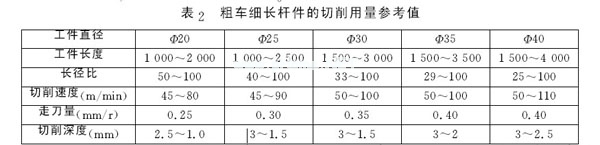 切削速度與切削力成反比。提高切削速度,切削溫度隨之升高,刀具與工件之間的摩擦力則減小,細(xì)長(zhǎng)桿的受力變形變小。但是,如果切削速度過(guò)高,又常會(huì)使細(xì)長(zhǎng)桿因離心力而出現(xiàn)彎曲,,影響切削過(guò)程的平穩(wěn)。因此,切削速度需要控制在適度范圍內(nèi)。桿件的長(zhǎng)徑比越大,切削速度越需適當(dāng)降低。粗車(chē)細(xì)長(zhǎng)桿件的切削用量參考值見(jiàn)表2。