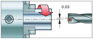 最小刀具跳動量是確保成功鉆削的必要因素。跳動量不應超過左圖中的值。對準的同時必須確保: